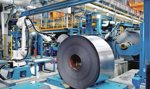 工业领域能源消费约占全社会能源消费的65%,而排放量占与能源相关的二氧化碳排放量的70%,其中化石燃料直接燃烧供热占比极高,工业领域供热亟需低碳化转型。图为山东省日照昱岚智造产业园的钢卷生产线。新华社
