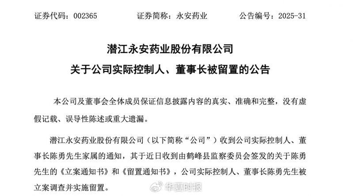 对于陈勇被调查的具体原因,永安药业并未提及,仅在公告中强调,目前公司其他董事、监事和高级管理人员均正常履职,公司控制权未发生变化,生产经营情况正常。对于留置、立案调查一事给公司经营带来哪些影响等问题,《华夏时报》记者致函永安药业,截至发稿未收到回复。