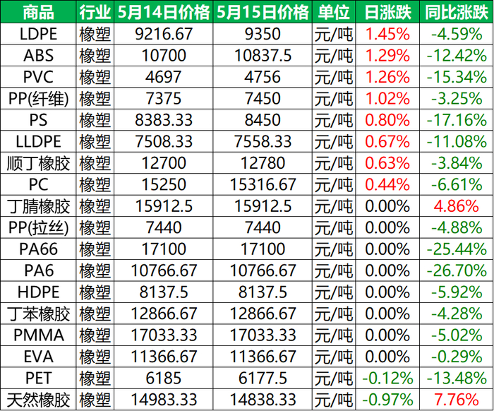 2025年5月15日大宗商品价格涨跌榜中橡塑板块环比上升的商品共8种,涨幅前3的商品分别为LDPE(1.45%)、ABS(1.29%)、PVC(1.26%)。
