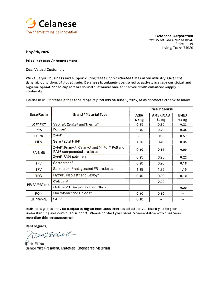塞拉尼斯此次调价主要基于多方面成本压力:产品运输和库存调配成本的上升、工厂运营费用的增加、贸易法规的变动以及原材料价格攀升,都是导致涨价的重要因素。