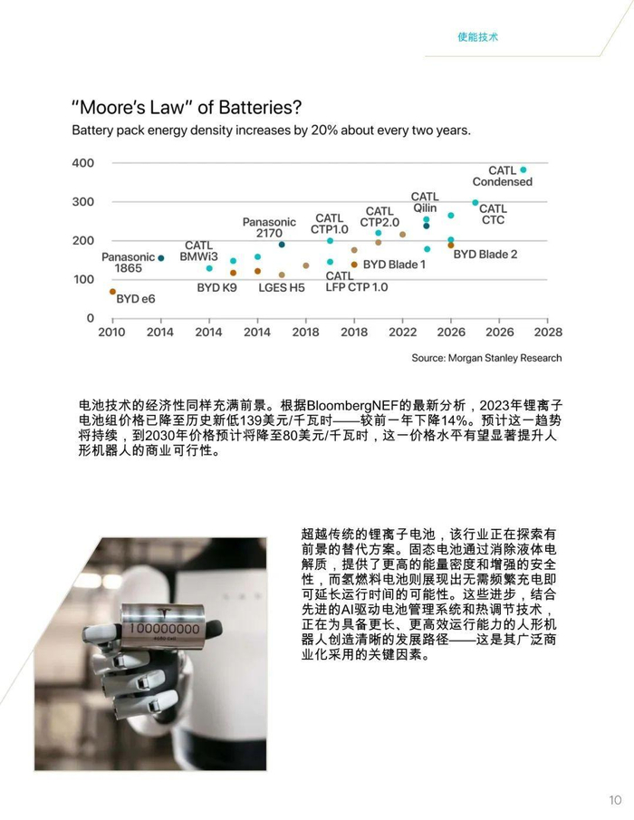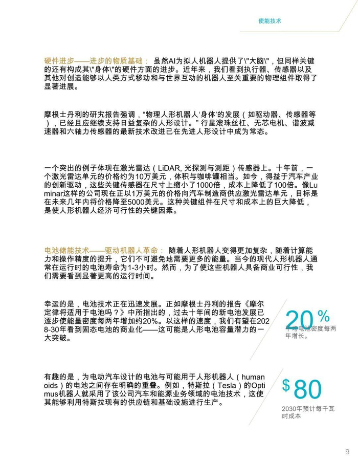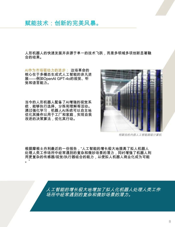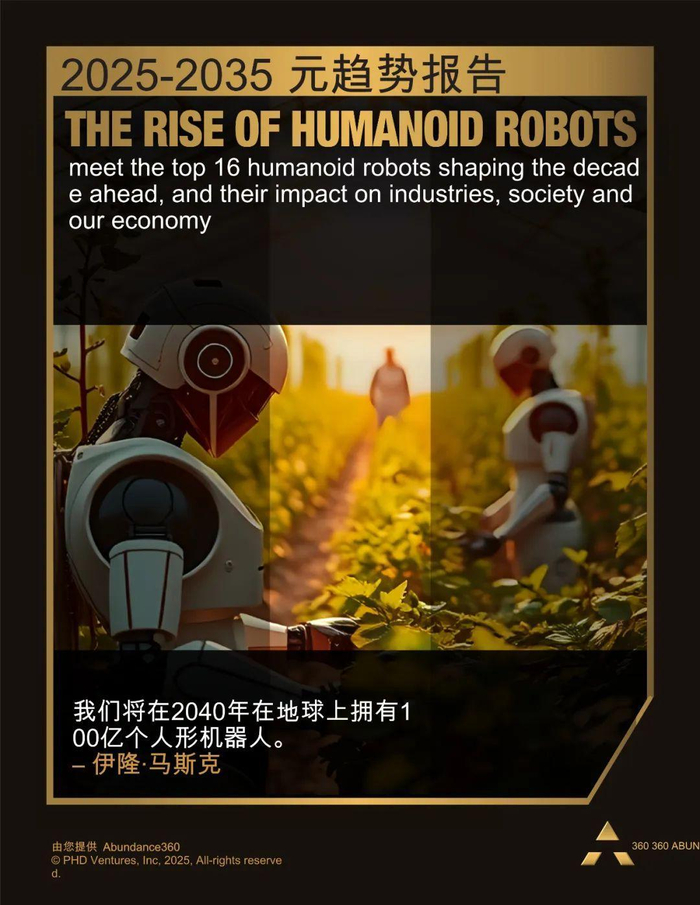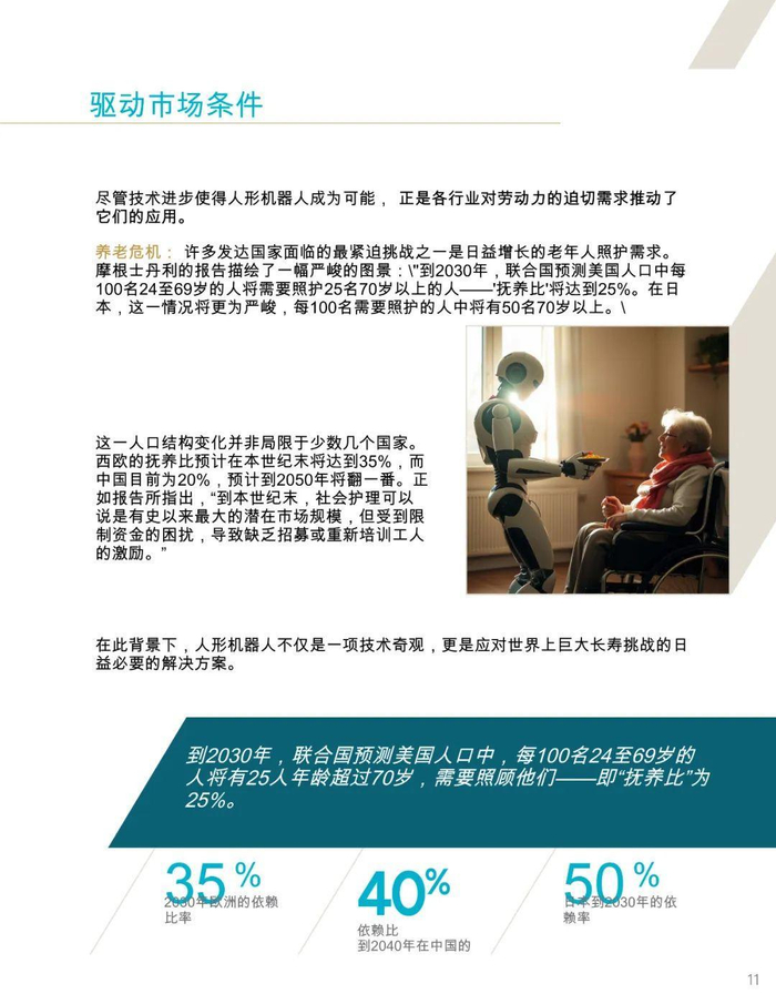 报告指出,到2040年地球上可能会有10亿至100亿个人形机器人,这一预测基于多模态生成式人工智能、高扭矩执行器、计算能力提升、电池续航增强以及摄像头和触觉传感器等五大技术领域的融合推动。人形机器人市场将迎来指数级增长,预计到2035年市场规模将达到380亿美元至24万亿美元。人形机器人的成本正在快速下降,从2024年的25万美元降至15万美元,未来可能进一步降至2万至3万美元,这将推动其在各行业的广泛应用,尤其是在应对全球劳动力短缺方面发挥关键作用。