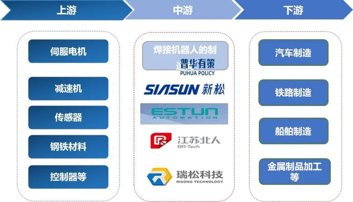 产业链下游主要应用领域包括汽车工业、船舶工业、装备制造以及其它钢结构加工领域。整体来看,焊接机器人产业链市场参与主体多元化特征明显。