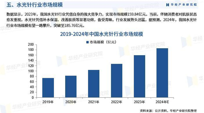数据显示,2023年,我国水光针行业凭借自身的强大竞争力,实现市场规模159.84亿元。当前,伴随消费者对肌肤状态愈发重视,水光针凭借补水保湿、改善肤质等显著功效,备受青睐。