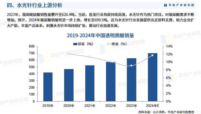 2023年,我国玻尿酸销售量攀升至626.4吨。当前,医美行业热度持续高涨,水光针作为热门项目,对玻尿酸需求不断增加。预计,2024年玻尿酸销量将进一步上扬,增长至699.5吨。