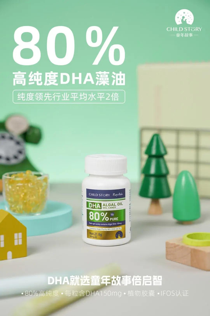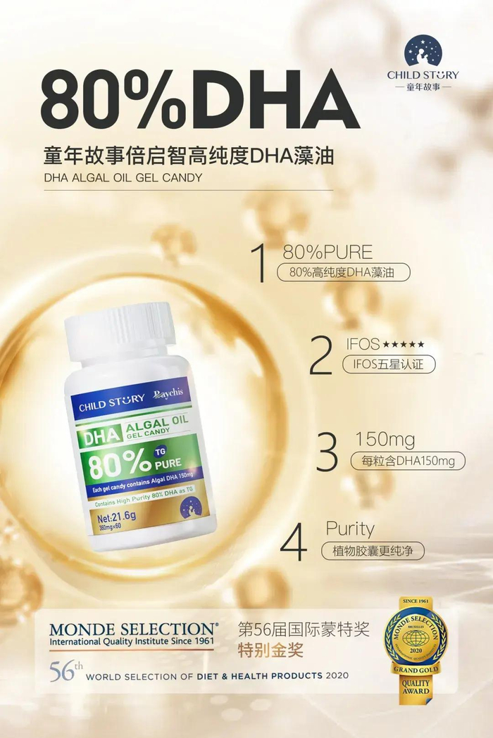 自2018年起,童年故事便专注于DHA赛道,始终遵循“天然甄萃,加倍出色”品牌理念,是国内率先推出纯度高达80%DHA的藻油品牌,也是国内首个获得IFOS五星认证的DHA藻油品牌。