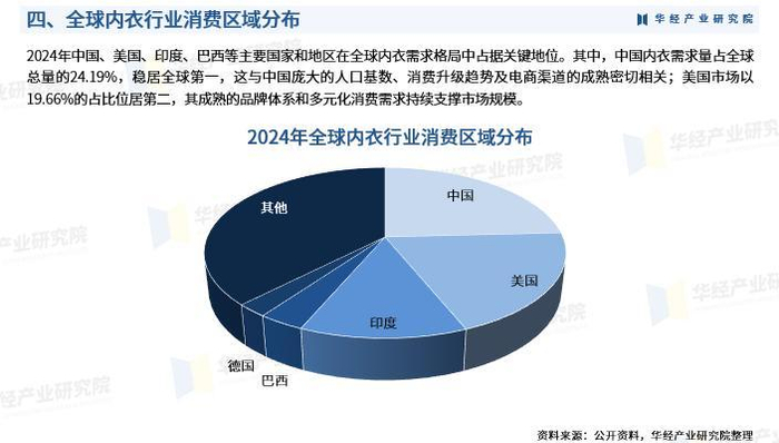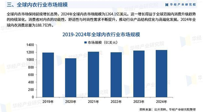 全球内衣市场保持延续增长态势,2024年全球内衣市场规模为1264.1亿美元。这一增长得益于全球范围内消费升级趋势的持续深化,消费者对内衣的功能性、舒适性与时尚性需求不断提升,推动行业产品结构优化与高端化发展。