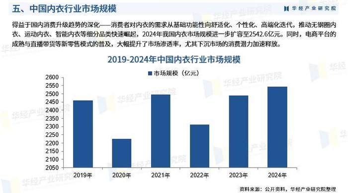 得益于国内消费升级趋势的深化——消费者对内衣的需求从基础功能性向舒适化、个性化、高端化迭代,推动无钢圈内衣、运动内衣、智能内衣等细分品类快速崛起,2024年我国内衣市场规模进一步扩容至2542.6亿元。同时,电商平台的成熟与直播带货等新零售模式的普及,大幅提升了市场渗透率,尤其下沉市场的消费潜力加速释放。