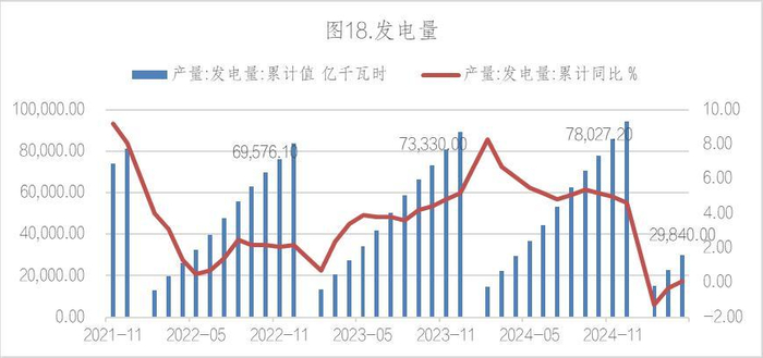 数据来源:Wind,英大期货2025年4月份全社会发电量为7111亿千瓦时,同比增长0.90%;1-4月份全社会发电量为29840亿千瓦时,同比增长0.10%。
