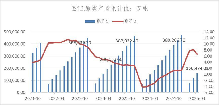 数据来源:Wind,英大期货2025年4月份生产原煤38931万吨,同比增长3.80%;1-4月份,生产原煤158474万吨,同比增长6.60%。