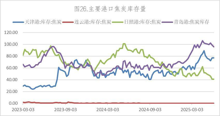 数据来源:Wind,英大期货2025年6月6日天津港、连云港、日照港、青岛港焦炭库存分别为77万吨、0.13万吨、41万吨和95.5万吨,环比上周分别减少0万吨、0.06万吨、0万吨和3万吨。