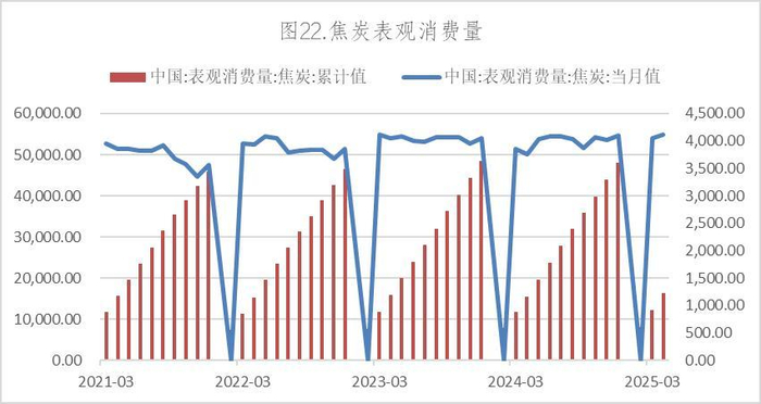 数据来源:Wind,英大期货2025年4月焦炭表观消费量4109.98万吨,较上年同期的3756.31万吨增加353.67万吨;1-4月焦炭表观消费量16218.49万吨,较上年同期的15518.57万吨增加699.92万吨。