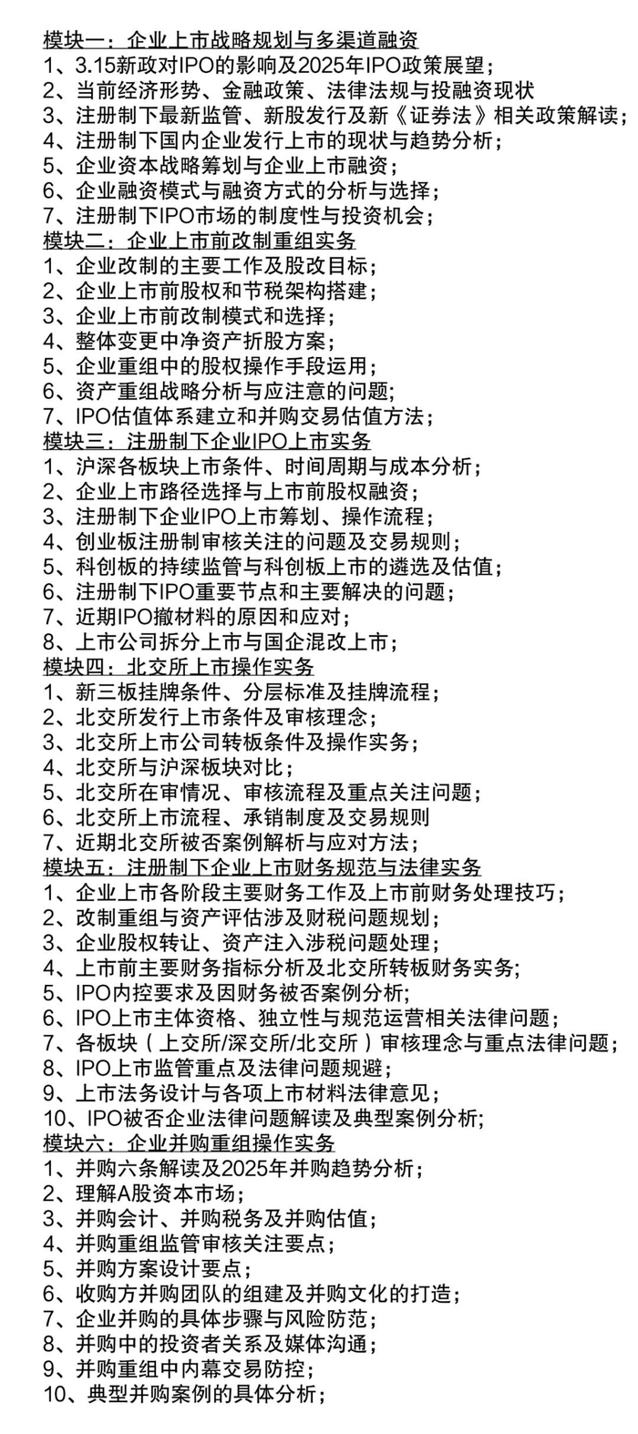 为帮助企业及相关机构全面了解我国资本市场的最新政策,掌握新形势下企业发行上市、并购重组等资本运营的重点难点问题,制定企业最佳上市融资方案和并购重组方案,深入了解监管要求,做好全过程规范运作,实现企业与资本成功对接!为此,中融商学将于7月在北京继续举办第77期“注册制下企业IPO上市及并购重组实务操作培训班”。