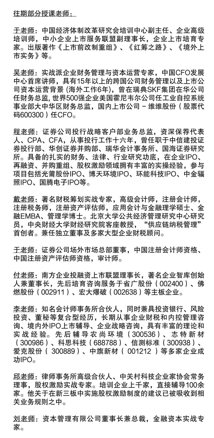 ◆ 上市诊断咨询:参加学习的企业,自主选择加入上市诊断沙龙,由专家进行现场一对一诊断,提出诊断方案,帮助企业规划上市。诊断时间为培训课程结束后次日,每期研修班限3家企业参与诊断,参加诊断企业需提前联系教务老师咨询具体安排。