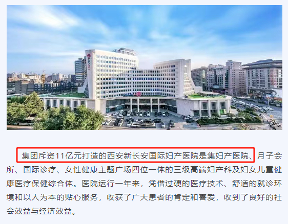 据新长安妇产医院官微披露,新长安妇产医院斥资11亿元打造,借鉴日本永远幸妇产医院等知名医院的建设发展模式,是一所集妇产医院、月子会所、国际诊疗、女性健康主题广场四位一体的三级高端妇产科及妇女儿童健康医疗保健综合体。