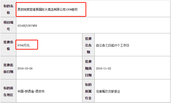 2016年9月,西安阿房宫维景国际大酒店五星级旅游饭店资格被取消。仅仅一个月后,该酒店全部股权在北交所挂牌出售,转让底价为8764万元。