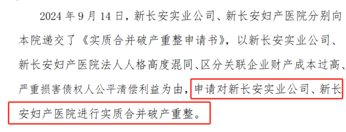 2024年9月14日,新长安实业公司、新长安妇产医院以两家企业法人人格高度混同、区分关联企业财产成本过高、严重损害债权人公平清偿利益为由,向西安中级人民法院递交了《实质合并破产重整申请书》,申请实质合并破产重整。