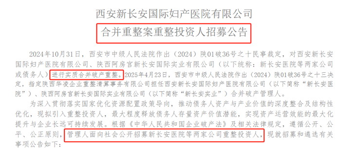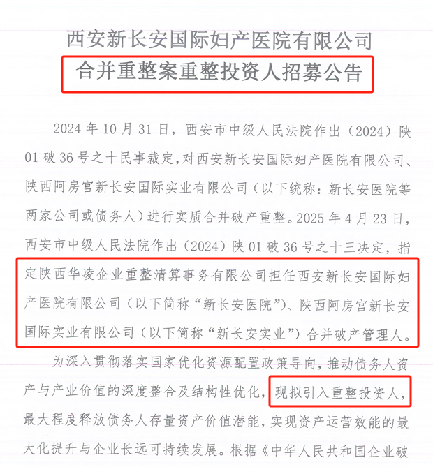 近期,西安市中级人民法院作出决定,指定陕西华凌企业重整清算事务有限公司担任西安新长安国际妇产医院有限公司(简称“新长安妇产医院”)、陕西阿房宫新长安国际实业有限公司(简称“新长安实业”)合并破产管理人,并正式面向社会公开招募重整投资人。