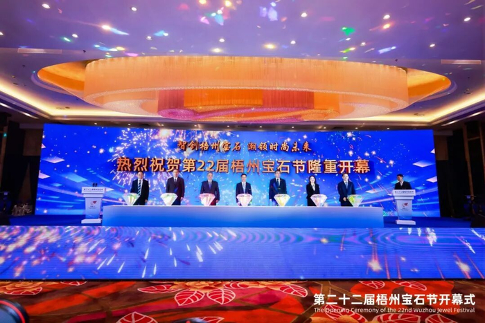 12月19日,以“智创梧州宝石潮领时尚未来”为主题的第二十二届梧州宝石节开幕。市委书记蒋连生,中国珠宝玉石首饰行业协会会长叶志斌,广西国际博览事务局党组成员,副局长梁艺光出席开幕式并致辞。市政协主席黄振饶,深圳市工业设计行业协会会长封昌红,北京时尚控股有限责任公司党委书记,董事长顾伟达,中国珠宝玉石首饰行业协会副会长兼秘书长毕立君,越南宝石协会副会长吴世学,市宝石商会会长潘旭平,香港贸易发展局广州代表何俏媚,北京时尚控股有限责任公司党委常委,副总经理段体玉等领导嘉宾出席开幕式。市委副书记,常务副市长汪东明主持开幕式。