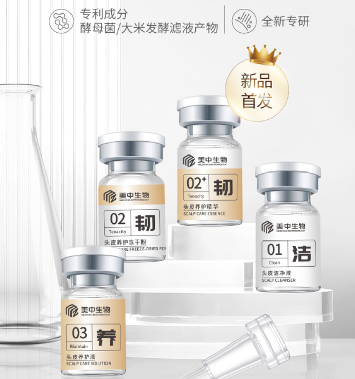 据介绍,美中生物通过“冷冻保鲜科技”打造的头皮养护冻干精华套盒,包括头皮清洁液、护发冻干粉+护发溶媒、头皮养护液等产品。产品由涂氏实验室自有菌株酵作而成,涂氏三基元与全新“酵母提取物”强力组合。产品创新性零添加防腐无刺激,全面升级了养护固发新标准,多重发酵净澈头皮,从源头修护毛囊,滋养赋活头皮,能够全面调理头皮健康问题,有效解决多种头皮问题。