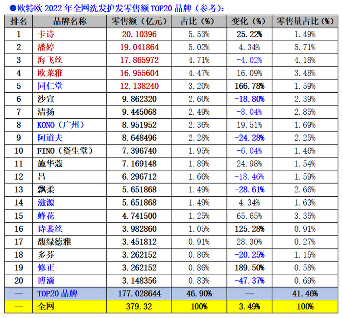 通过欧特欧2022年全网洗发护发零售额TOP20品牌排行榜,以及2023上海CBE本土洗护发企业(品牌)展示产品,美妆头条发现中国本土洗护发品牌“破局”突围、实现高质量发展的“六大”路径如下: