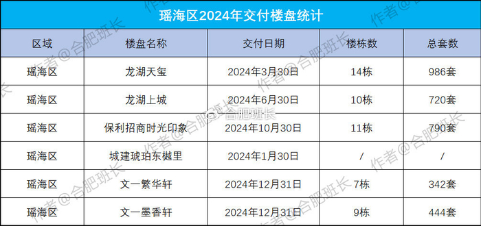 瑶海区2024年预计有5个新盘交付,分别是:龙湖天玺、龙湖上城、保利招商时光印象、文一繁华轩和文一墨香轩。