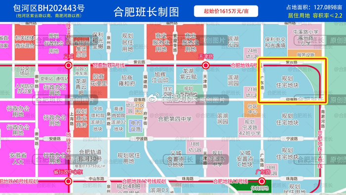 包河区BH202443号地块位于紫云路以南、南淝河路以西,属于滨湖区省府东板块,占地127.0898亩,为居住用地,容积率2.2。