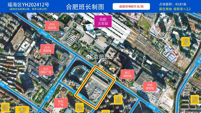 瑶海区YH202412号地块位于站前路以南、敬亭山路以西,占地43.8057亩,为居住用地,容积率2.2。