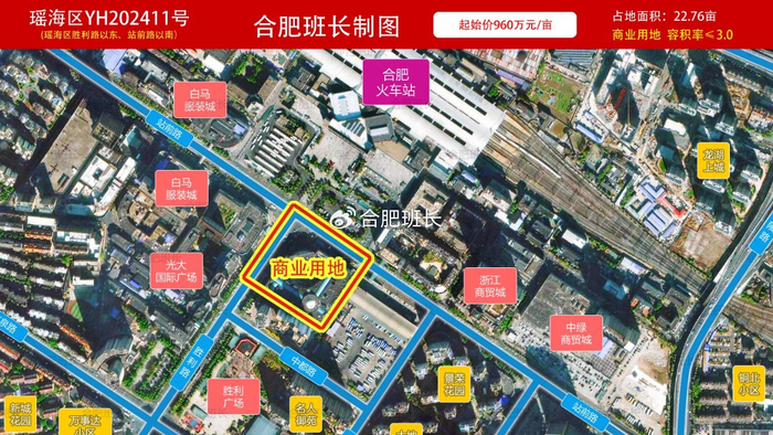 瑶海区YH202411号地块位于胜利路以东、站前路以南,占地22.7569亩,为商业用地,容积率3.0,也就是原新鸿安商城地块拆迁改造项目。