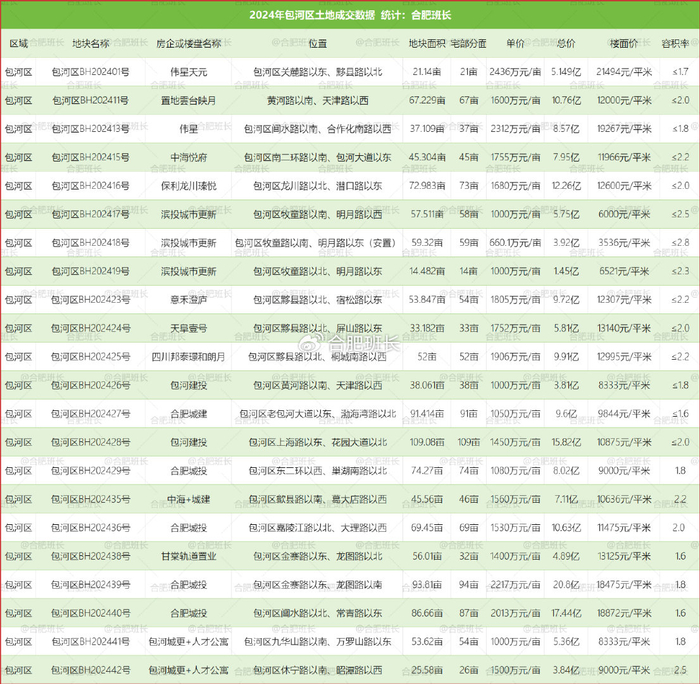2024年合肥所有涉宅地块成交总表分享: