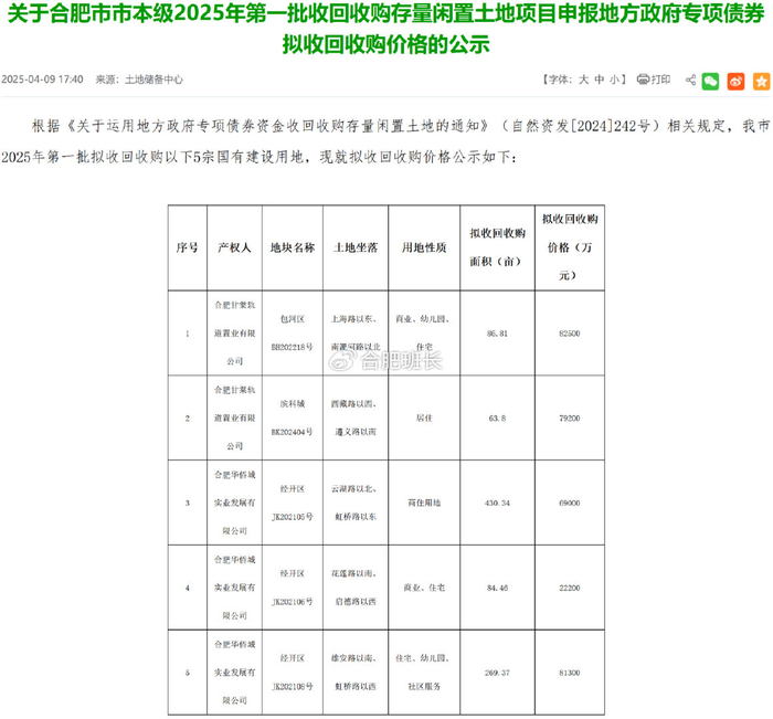 合肥市区也在4月9日发布《关于合肥市市本级2025年第一批收回收购存量闲置土地项目申报地方政府专项债券拟收回收购价格的公示》,拟收回收购以下5宗国有建设用地。