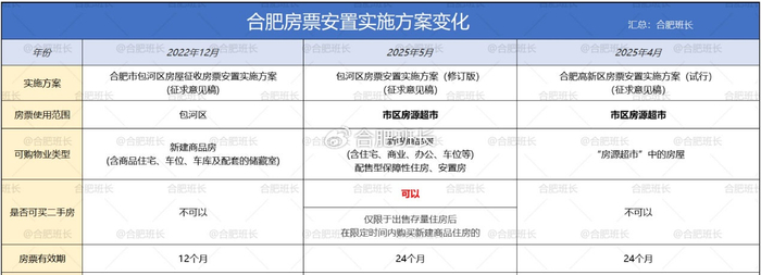 近日,包河区也发布《包河区房票安置实施方案(修订版)(征求意见稿)》,为了方便大家了解新/旧房票安置政策的不同,班长整理了2022年包河区、2025年包河区和高新区的实施方案,做了表格对比。(PS:征集意见稿,以正式文件为准,仅供参考)