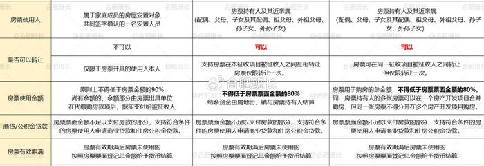房票使用人:2022年包河区规定房票使用仅限于房票开具的使用人本人,2025年高新区和包河区规定房票持有人及其近亲属(配偶、父母、子女及其配偶、祖父母、外祖父母、孙子女、外孙子女)可作为房票使用人。