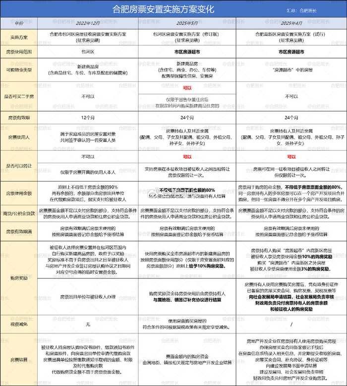 以上就是2022年和2025年合肥部分区域房票安置实施方案的对比,整体上看在使用范围、可购物业类型、房票使用人、房票转让、购房奖励等方面都有了很大变化,更利于房票的使用、推广。