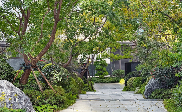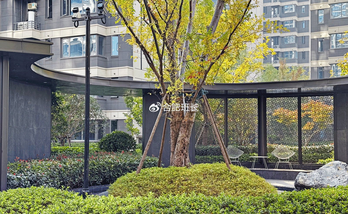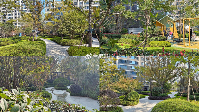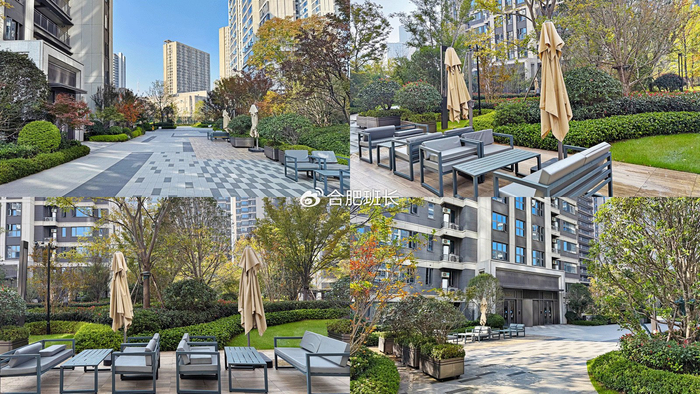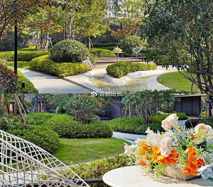 小区中心还有一方小广场,两座半圆形观景亭遥遥相对,亭间点缀着景观石,几株景观树错落植于其间,自成一派雅致小景。