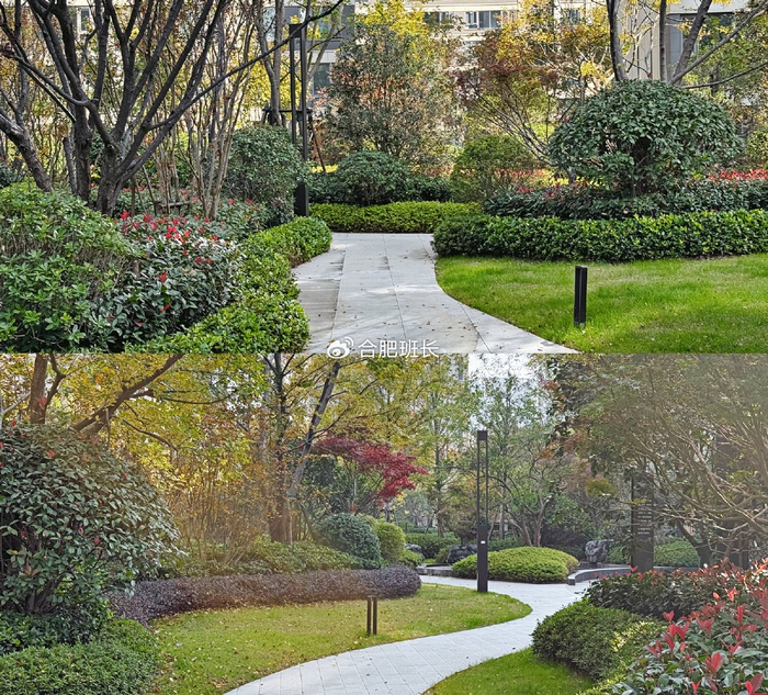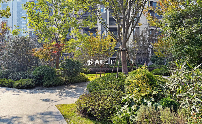 龙湖打造的宅前绿化层次十分丰富,单元号景墙被低矮灌木与花境巧妙掩映,一旁还栽种着桂花、红枫、紫藤等多种景观树木,布局层次分明、错落有致。