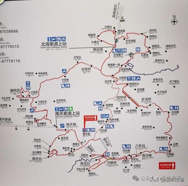 自南天索道上至北海索道下,数公里的旅程,均在高数百米的高空栈道上行进。其间依次行走在无为道、飞鹰道、观音道、因缘道、般若道与菩提道上,移步换景,如置身于仙境之中,以前隐匿在深山密林中的峰岩嶂壁,兀然展现在你的面前,近距离多角度地欣赏到这些优美的天然画卷。