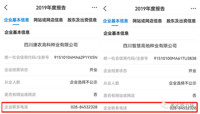 但即便是所谓的“财务投资”,刘玉成可也不是种子销售行业的小白,他还是康农种业有一个重要客户智慧高地的控股股东。更有意思的是,早在四川康农还是康农种业控股子公司并纳入合并范围的2019年,四川康农的企业联系电话就是智慧高地是一样的,这又是康农种业的一家“影子公司”吗?