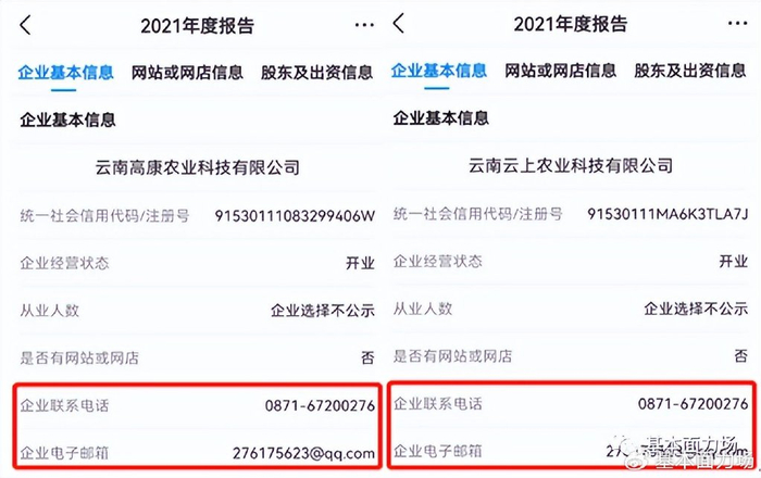 “云南高康农业科技有限公司”,这家公司2021年度的企业联系电话、企业电子邮箱,都与另外一下名为“云南云上农业科技有限公司”一致,而“云南云上农业科技有限公司”则是由贺利强持股35%并担任监事的公司,说白了“云南云上农业科技有限公司”就是四川康农的关系户;而康农种业的第一大客户,就与这个关系户存在微妙的联系,这又是康农种业的一家“影子公司”吗?