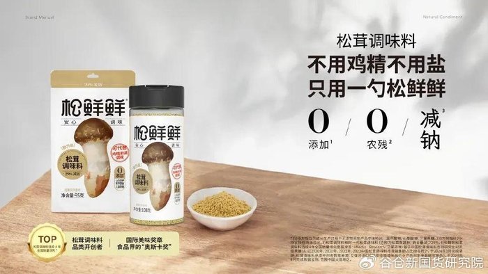 新品牌名的“松”,让用户直接联想到产品的强价值点“松茸”。叠字“鲜鲜”则强化了产品的功效,松茸提鲜,并且连起来读郎朗上口,更容易传播。