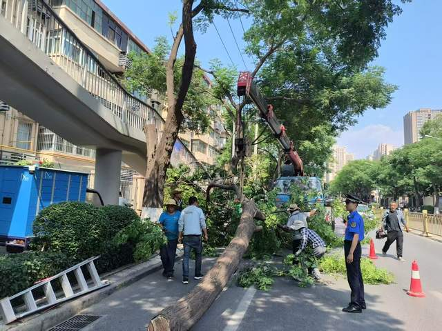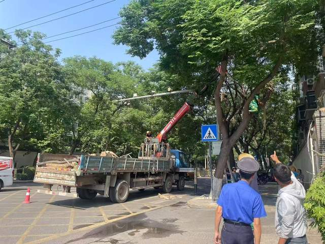 安全守护不仅在于预防,更在于快速响应。受近期大风天气影响,辛家庙中队执法队员在巡查中发现,辖区太元路四十八中天桥处、太元路与糖库路十字南侧各有一棵大树出现倾斜,对行人和车辆通行构成潜在威胁。险情就是命令!5月28日当天,执法中队迅速联动局绿化科,调配专业吊车设备,组织精干力量赶赴现场。