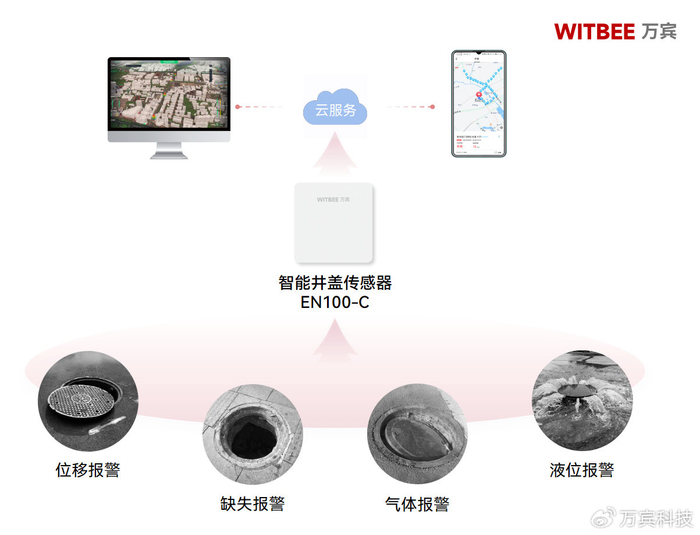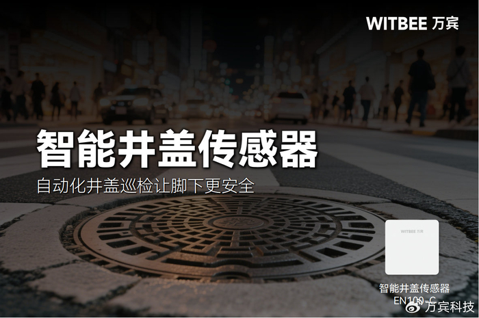WITBEE®万宾科技®智能井盖传感器EN100-C的应用开启了无人值守的自行巡检模式,它并非单一的数据监测设备,也拥有自己的“思考”能力。比如,当井盖出现翻转、倾斜、位移、水浸等异常状态时,可以实现远程自动预警,为监管单位的及时介入提供了重要保障。