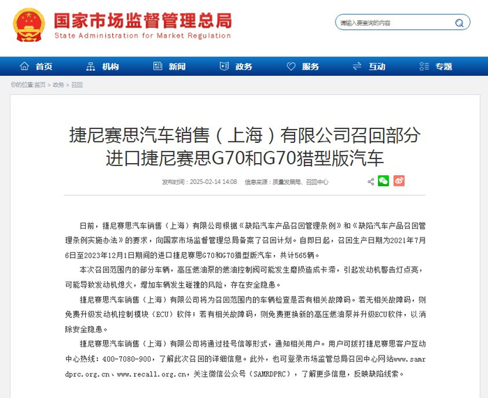 中新经纬2月14日电 国家市场监督管理总局网站14日消息,日前,捷尼赛思汽车销售(上海)有限公司根据《缺陷汽车产品召回管理条例》和《缺陷汽车产品召回管理条例实施办法》的要求,向国家市场监督管理总局备案了召回计划。自即日起,召回生产日期为2021年7月6日至2023年12月1日期间的进口捷尼赛思G70和G70猎型版汽车,共计565辆。