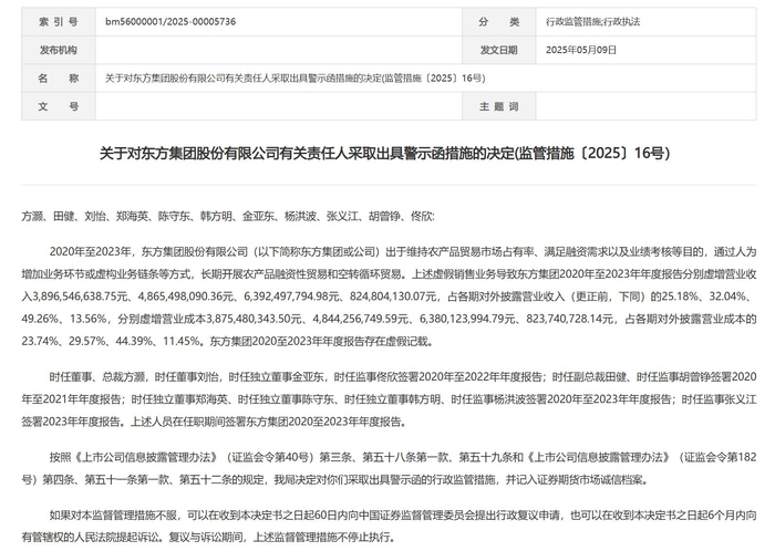 同日,黑龙江证监局公布另一则对东方集团有关责任人采取出具警示函措施的决定(监管措施〔2025〕16号),涉及对象包括方灏、田健、刘怡、郑海英、陈守东、韩方明、金亚东、杨洪波、张义江、胡曾铮、佟欣,共计11人。