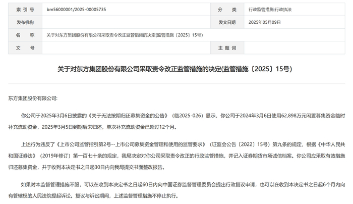 黑龙江证监局指出,东方集团于2025年3月6日披露的《关于无法按期归还募集资金的公告》(临2025-026)显示,公司于2024年3月6日使用62898万元闲置募集资金临时补充流动资金,2025年3月5日到期后未归还,单次补充流动资金已超过12个月。