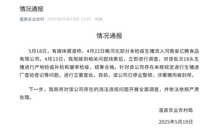 “温县农业农村”微信号截图河南温县农业农村局称,5月18日,有媒体报道称,4月22日晚河北部分未检疫生猪流入河南省亿腾食品有限公司。