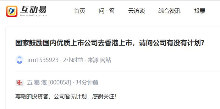【V观财报丨五粮液:暂无计划赴港上市】五粮液28日通过深交所互动易平台回答投资者提问称,公司暂无计划去香港上市。(中新经纬APP)