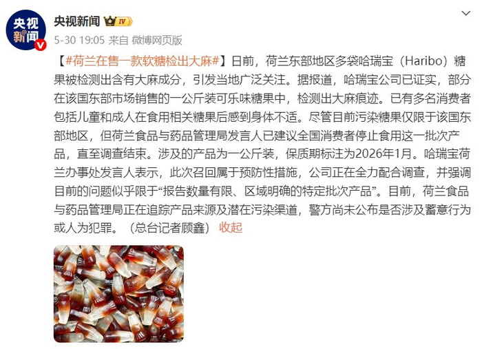 哈瑞宝淘宝旗舰店客服提供图片日前,荷兰东部地区多袋哈瑞宝(Haribo)糖果被检测出含有大麻成分。据央视新闻报道,哈瑞宝公司已证实,部分在该国东部市场销售的一公斤装可乐味糖果中,检测出大麻痕迹。已有多名消费者包括儿童和成人在食用相关糖果后感到身体不适。尽管目前污染糖果仅限于该国东部地区,但荷兰食品与药品管理局发言人已建议全国消费者停止食用这一批次产品,直至调查结束。涉及的产品为一公斤装,保质期标注为2026年1月。哈瑞宝荷兰办事处发言人表示,此次召回属于预防性措施,公司正在全力配合调查,并强调目前的问题似乎限于“报告数量有限、区域明确的特定批次产品”。目前,荷兰食品与药品管理局正在追踪产品来源及潜在污染渠道,警方尚未公布是否涉及蓄意行为或人为犯罪。