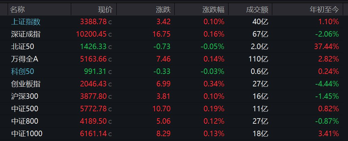 中新经纬6月9日电 9日,A股三大指数集体高开,上证指数涨0.10%,报3388.78点;深证成指涨0.16%,报10200.45点;创业板指涨0.34%,报2046.43点。