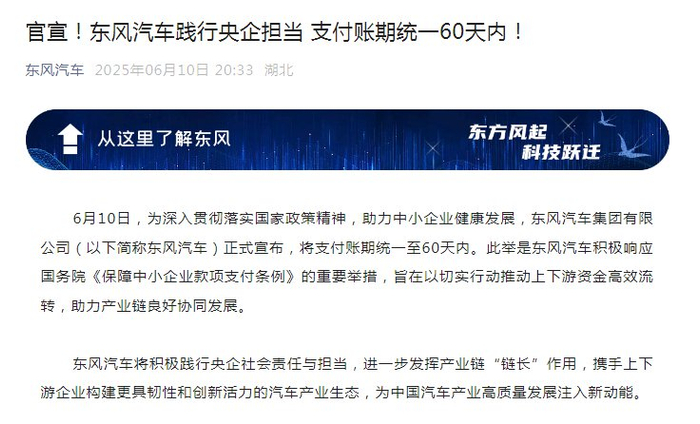 来源:东风汽车公众号东风汽车6月10日发布消息称,为深入贯彻落实国家政策精神,助力中小企业健康发展,东风汽车集团有限公司(以下简称东风汽车)正式宣布,将支付账期统一至60天内。此举是东风汽车积极响应国务院《保障中小企业款项支付条例》的重要举措,旨在以切实行动推动上下游资金高效流转,助力产业链良好协同发展。