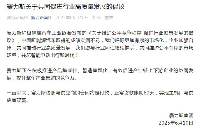 来源:赛力斯集团公众号赛力斯6月10日发布关于共同促进行业高质量发展的倡议。赛力斯积极响应汽车工业协会发布的《关于维护公平竞争秩序 促进行业健康发展的倡议》,中国新能源汽车取得的成绩实属不易,我们呼吁更加有序的市场化,企业加强自律,共同推动行业高质量发展。我们愿与行业同仁继续携手,共同维护公平有序的市场环境,共筑智能电动出行新时代!